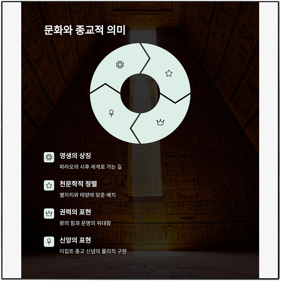 문화와 종교는 분리될 수 없다는 걸 이집트인들은 몸소 보여줬어요. 피라미드는 그들의 세계관과 가치관을 입체적으로 표현한 결과물이에요. 🕊️